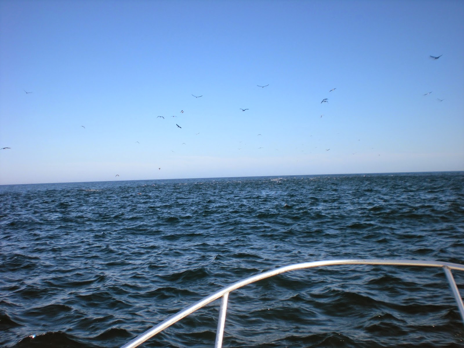 Atunes comiendo en la superficie bajo pajarera.