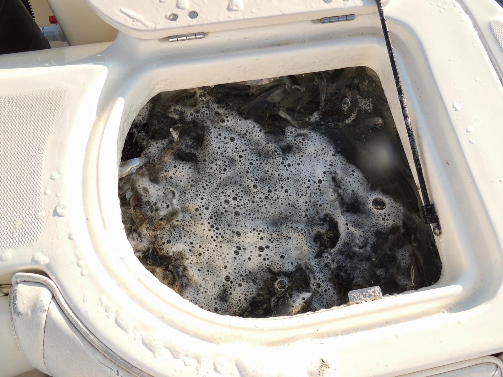 Un vivero lleno de sardina viva de 2 a 3 pulgadas para ser usada como chum para los atunes.